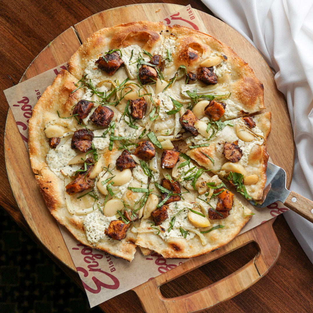 Indulge in our delectable wood-fired pizza crafted with our homemade dough and adorned with distinctive toppings, creating a remarkable gastronomic experience.
